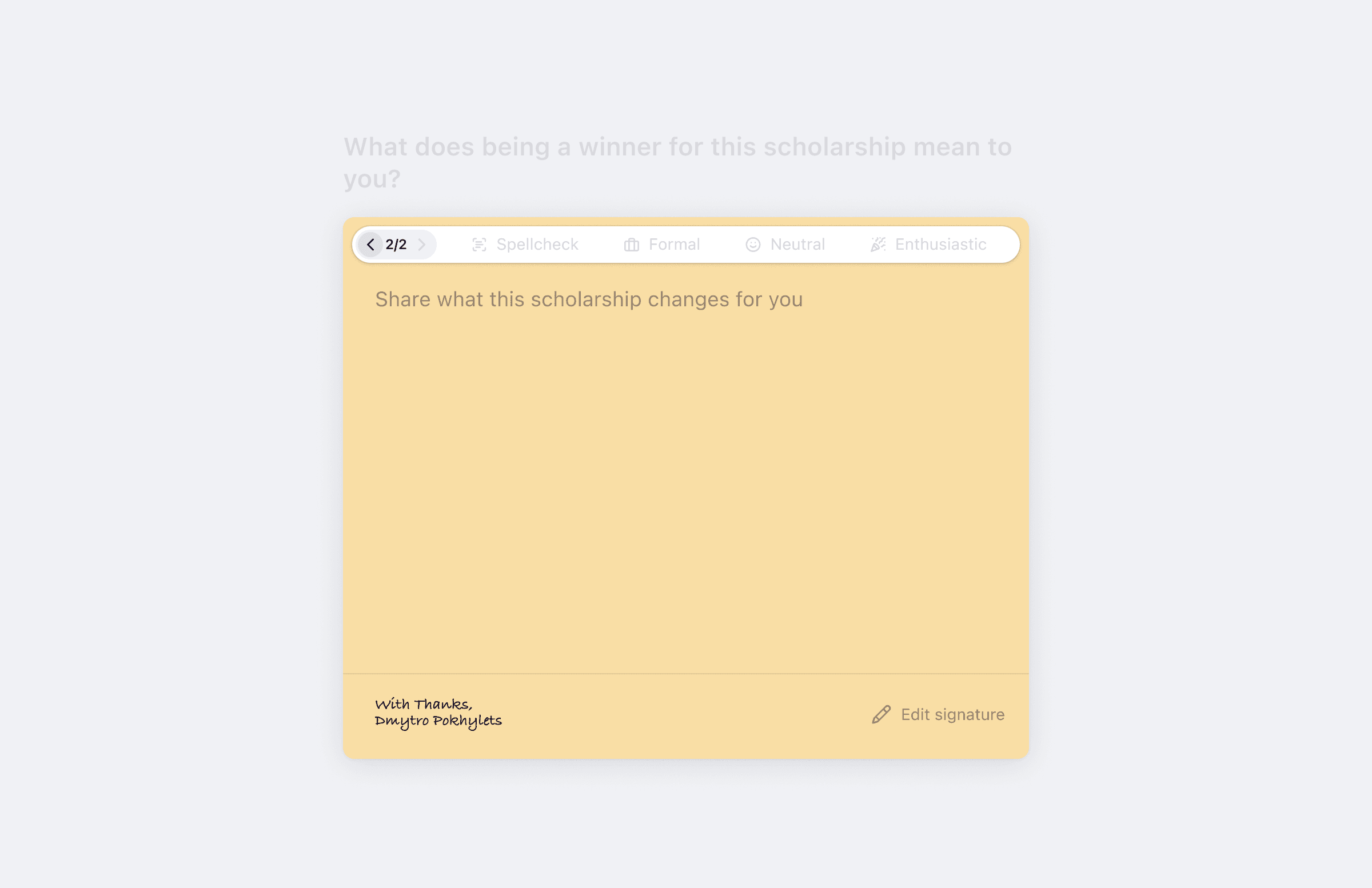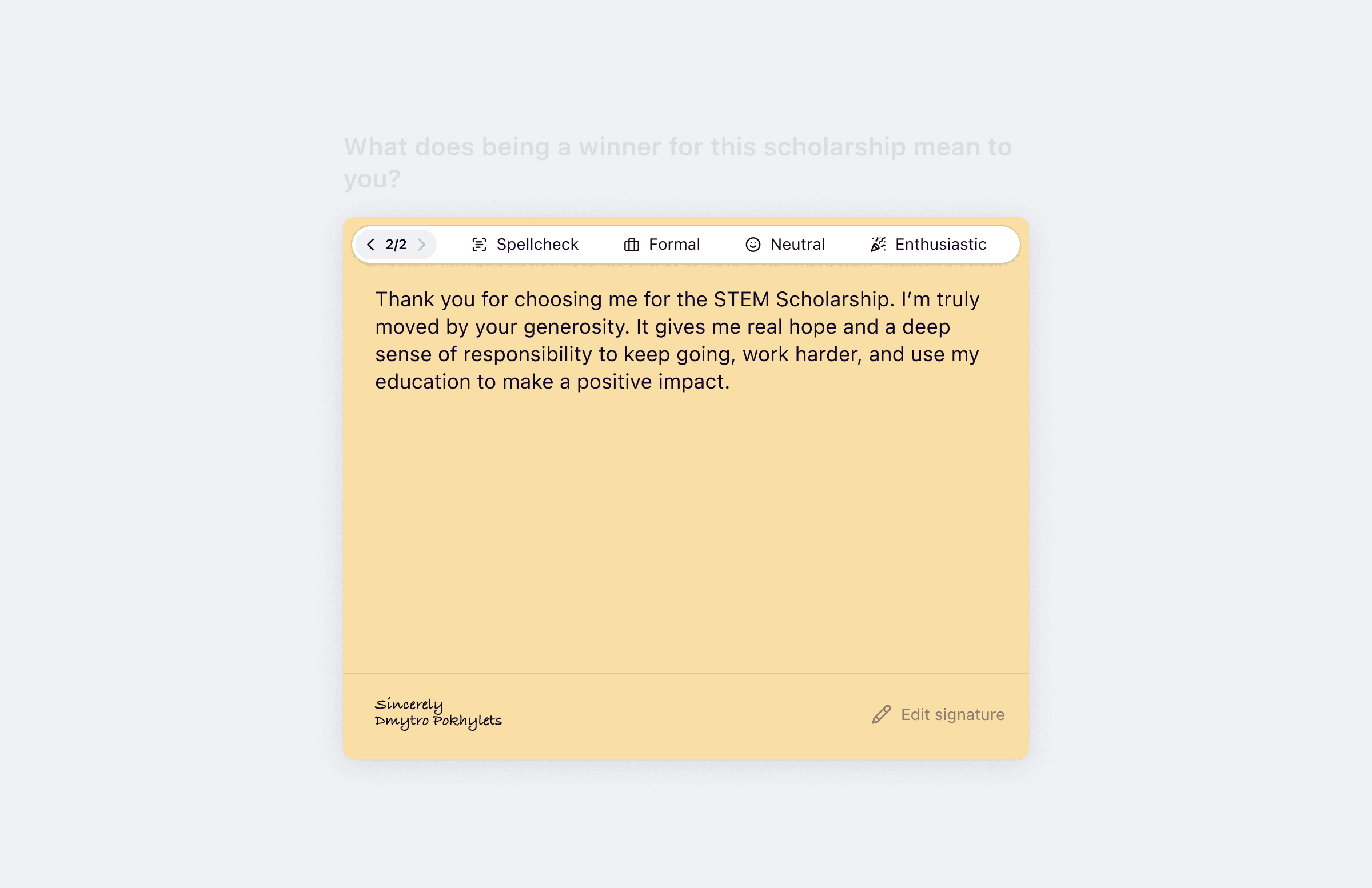 Solution: We generated a ready‑to‑submit, draft using donor mission, scholarship description, winning essay and student profile.