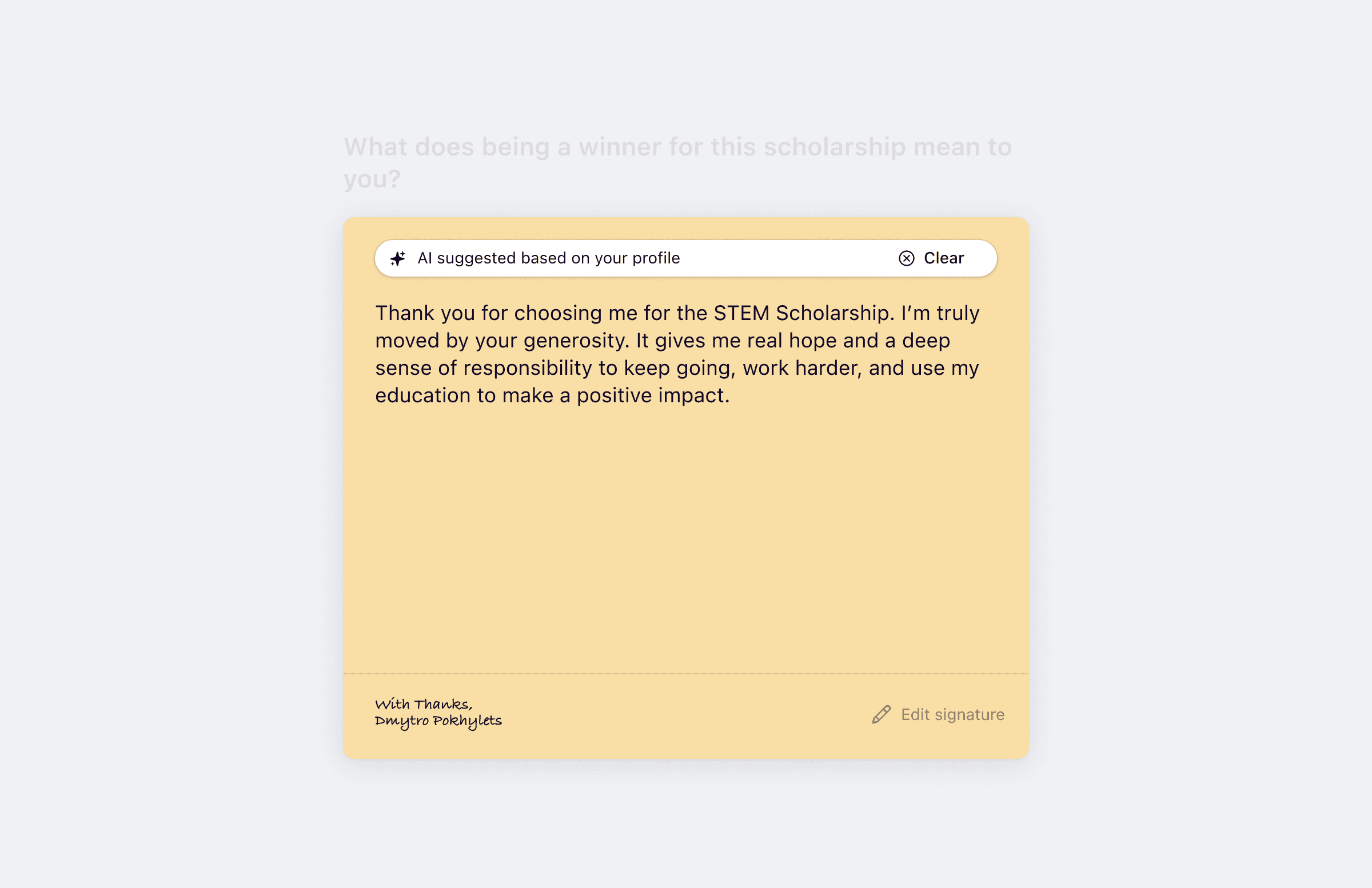 By the time a scholarship is awarded, we already have the ingredients for a meaningful thank-you. The donor profile and mission show what the sponsor values, the scholarship description explains the purpose, and the winning essay plus student profile capture the student’s voice, goals, and constraints.