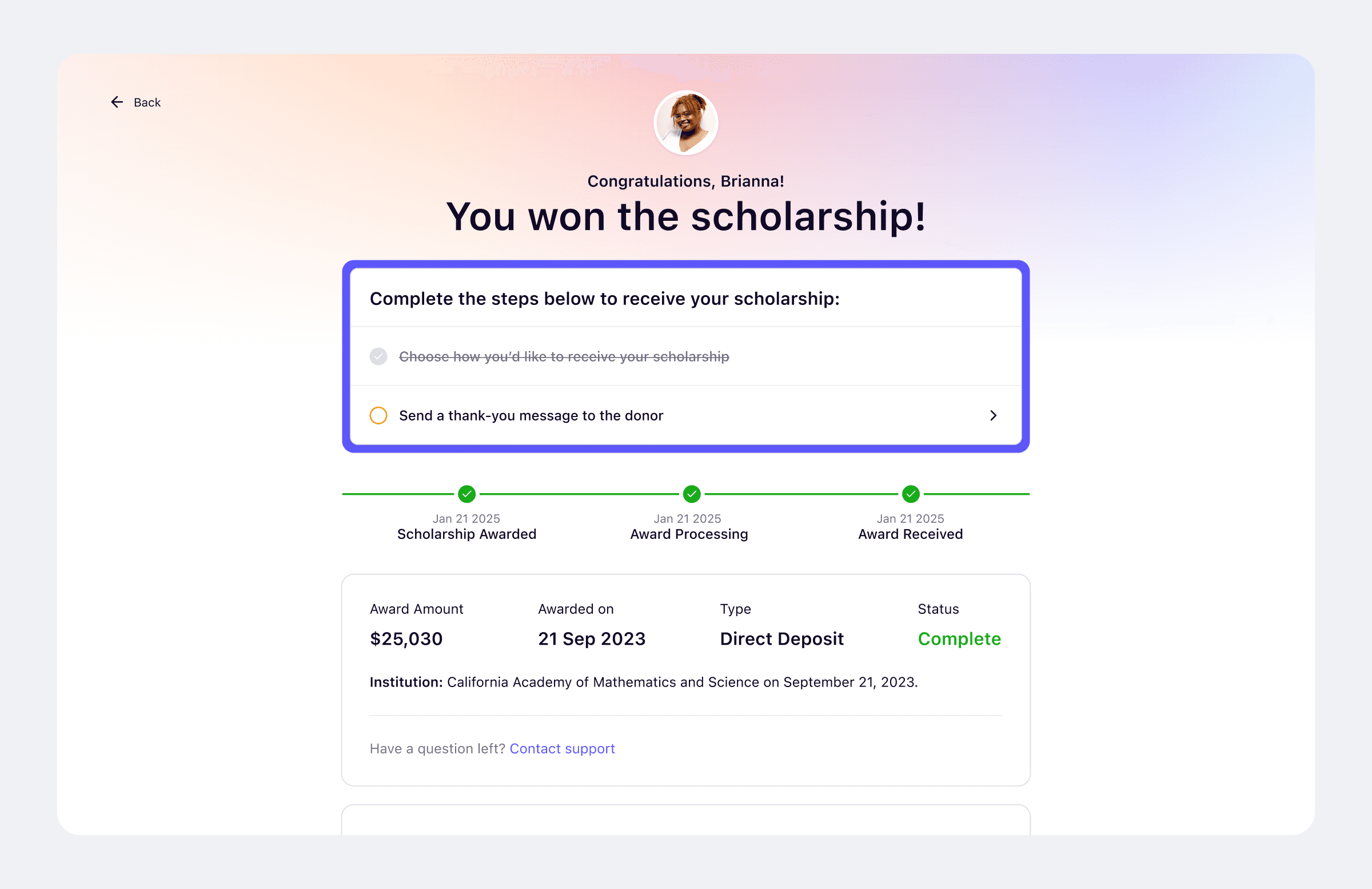 At launch, thank-you notes lived inside each scholarship, and most donors found them through email because that is where they already pay attention.